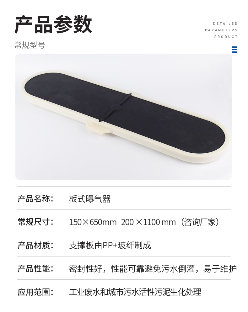 板式曝气器设计结构使曝气器系统在较宽的工作气量范围内保持低能耗、高效率;开孔方式,在鼓风机工作的过程中,曝气器产生的气泡均匀,达到很好的莲花效应;该曝气即可用于间歇运行系统,又可用于连续曝气系统,具有氧利用率高,性能可靠,曝气器具有自动止回功能,有效防止污水倒灌,使用寿命长等特点。